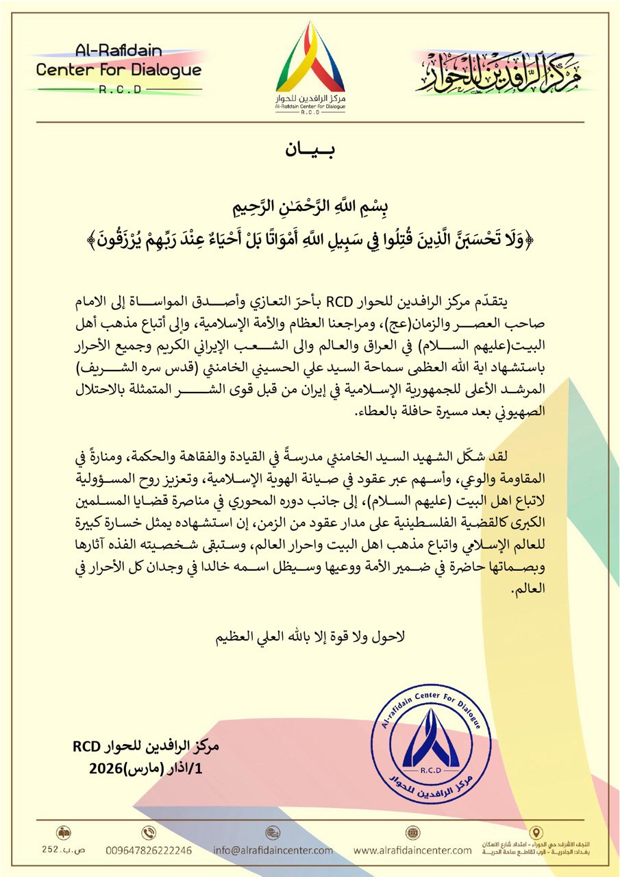 يتقدّم مركز الرافدين للحوار RCD بأحرّ التعازي وأصدق المواساة إلى الامام صاحب العصر والزمان(عج)، ومراجعنا العظام والأمة الإسلامية، وإلى أتباع مذهب أهل البيت(عليهم السلام) في العراق والعالم والى الشعب الإيراني الكريم وجميع الأحرار، باستشهاد اية الله العظمى سماحة السيد علي الحسيني الخامنئي(قدس سره الشريف) المرشد الأعلى للجمهورية الإسلامية في إيران من قبل قوى الشر المتمثلة بالاحتلال الصهيوني بعد مسيرة حافلة بالعطاء.