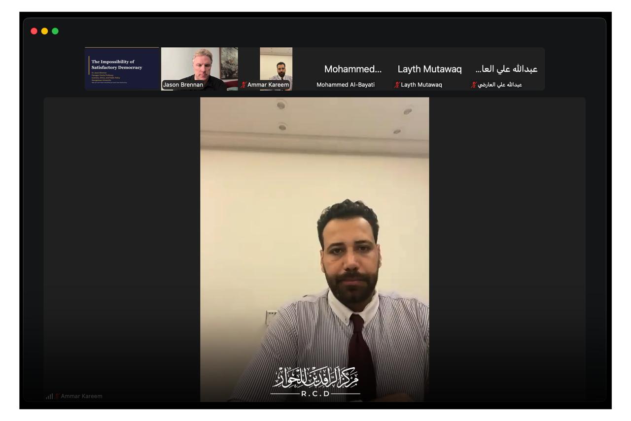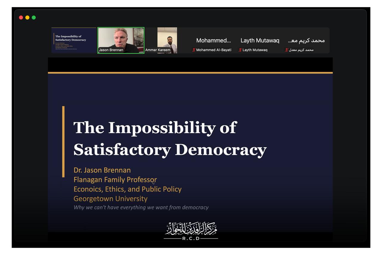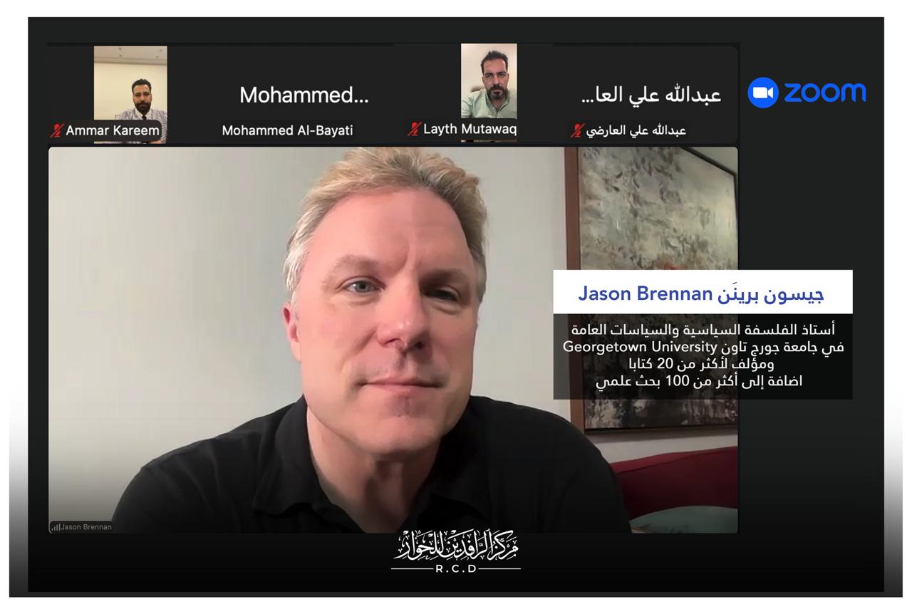 ضمن سلسلة الجلسات الحوارية التي ينظمها مركز الرافدين للحوار RCD، عبر منصة Zoom (زووم)، عقد المركز جلسة نقاشية إلكترونية افتراضية بعنوان:“لماذا لا يستطيع أي نظام سياسي تلبية جميع المُثُل الديمقراطية؟”، استضاف فيها السيد "جيسون برينَن Jason Brennan" أستاذ الفلسفة السياسية في جامعة جورج تاون Georgetown University”.