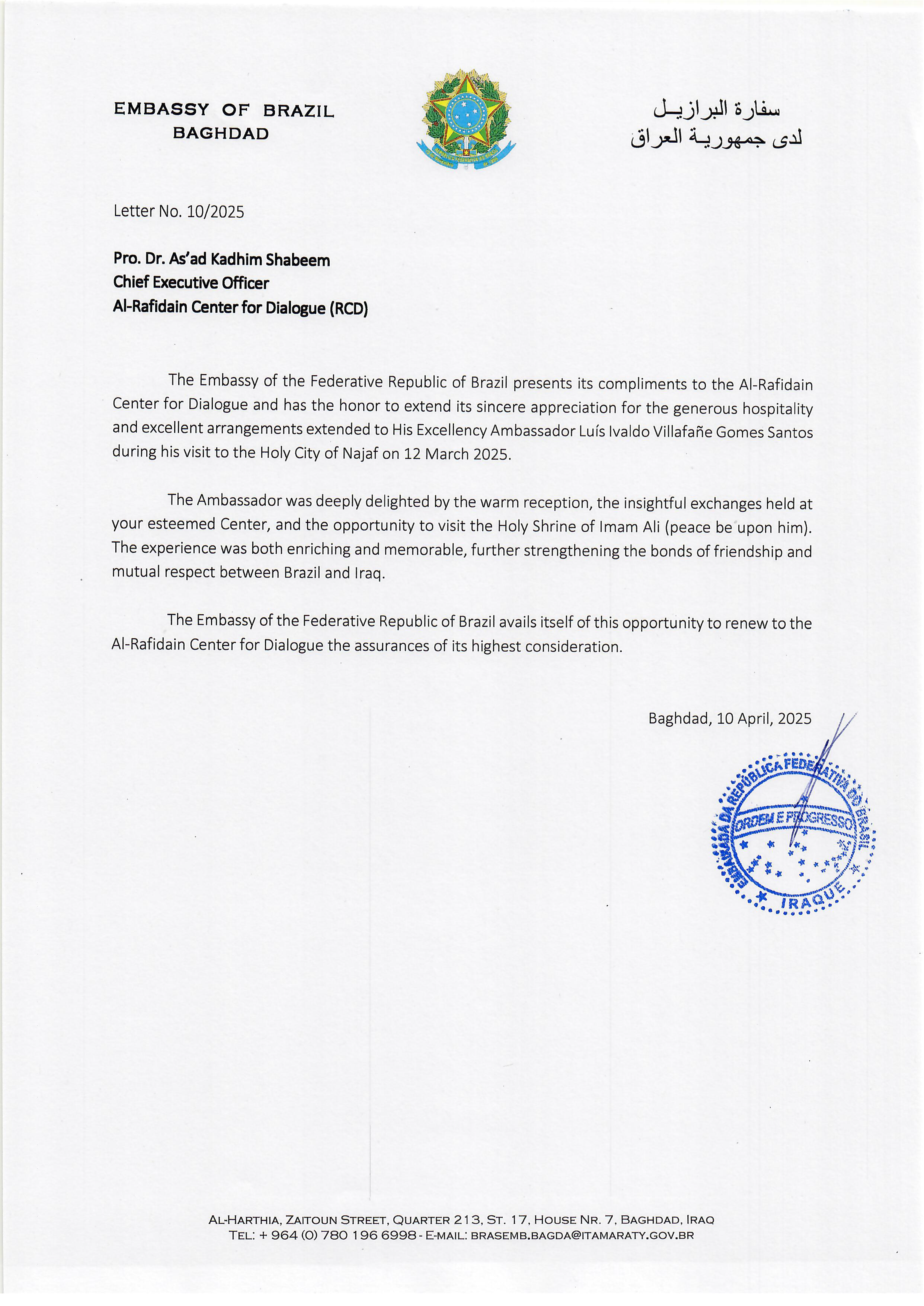 أعربت سفارة جمهورية البرازيل الاتحادية في العراق عن شكرها وتقديرها إلى مركز الرافدين للحوار RCD بعد الزيارة التي قام بها سعادة السفير (لويس إيفالدو) إلى المركز والتي جاءت في سياق زيارته الى مدينة النجف الأشرف في آذار - مارس 2025.