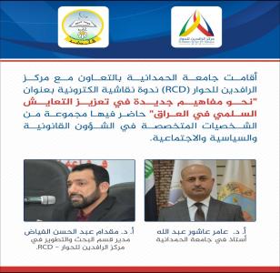 Under the patronage of Al-Hamdaniya University and with the participation of Al-Rafidain Center for Dialogue (RCD), a virtual seminar was held on ZOOM titled "Towards New Concepts in Promoting Peaceful Coexistence in Iraq." The event was attended by numerous interested social and academic figures.